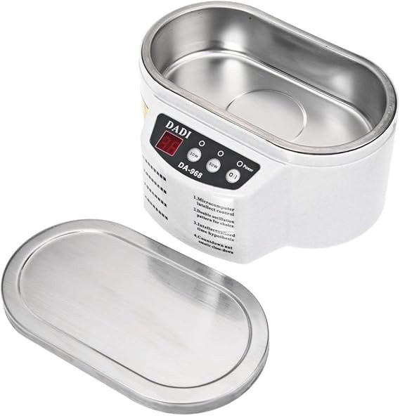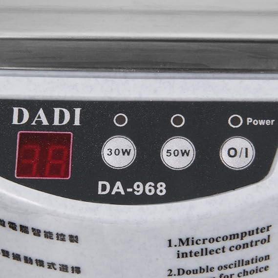 Descripción: limpiador ultrasónico DA-968 de Loskii para joyas, gafas, circuito, monedas, maquinillas de afeitar, dentaduras, herramientas de limpieza de gafas, control inteligente, limpiador ultrasónico. Características: circuito de protección especial, sistema de control inteligente. Pequeño y ligero, fácil de transportar y fácil de operar. Pervasivo, toda la superficie del objeto se puede limpiar en el líquido. Limpieza no destructiva, limpieza ultrasónica no hará El objeto causa cualquier daño: elimina la suciedad, el polvo, la grasa de los lugares más pequeños con tecnología ultrasónica. Adecuado para la limpieza de joyas, gafas, placas de circuito, adornos, gorros, broches, bolígrafos, CD, cepillo de dientes, dientes falsos, botella de leche, fruta, reloj, instrumentos exactos, etc. Especificaciones: Capacidad: 600 ml. Voltaje de entrada: 220 V – 50 Hz / 110 V – 60 Hz. Potencia de consumo: 30 W / 50 W. Frecuencia ultrasónica: 40 KHz. Tamaño interior del baño: 16 x 8 x 3,8 cm. Escala de tiempo ajustable: 30 W: 1 - 60 minutos, 50 W: 1 – 30 minutos. El paquete incluye: 1 limpiador ultrasónico Loskii DA-968.